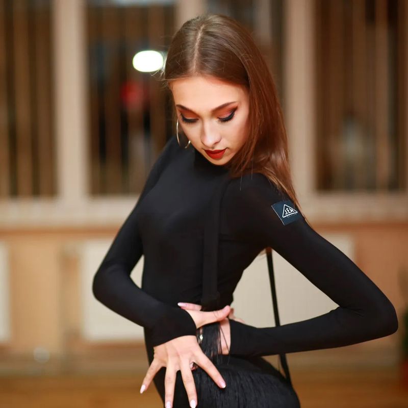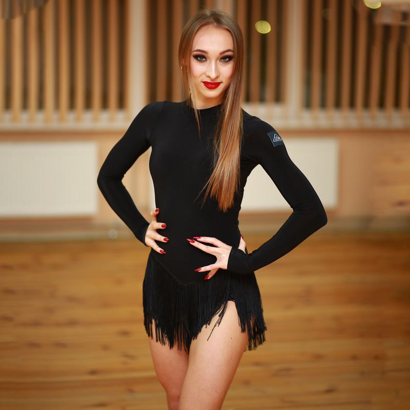 Боди красиво подчеркивает силуэт. Нижний край украшен бахромой, которая придает подвижности и эффектности каждому шагу. Сдержанный дизайн сочетается с ярким акцентом, делая модель универсальной для тренировок и сценических выступлений.
